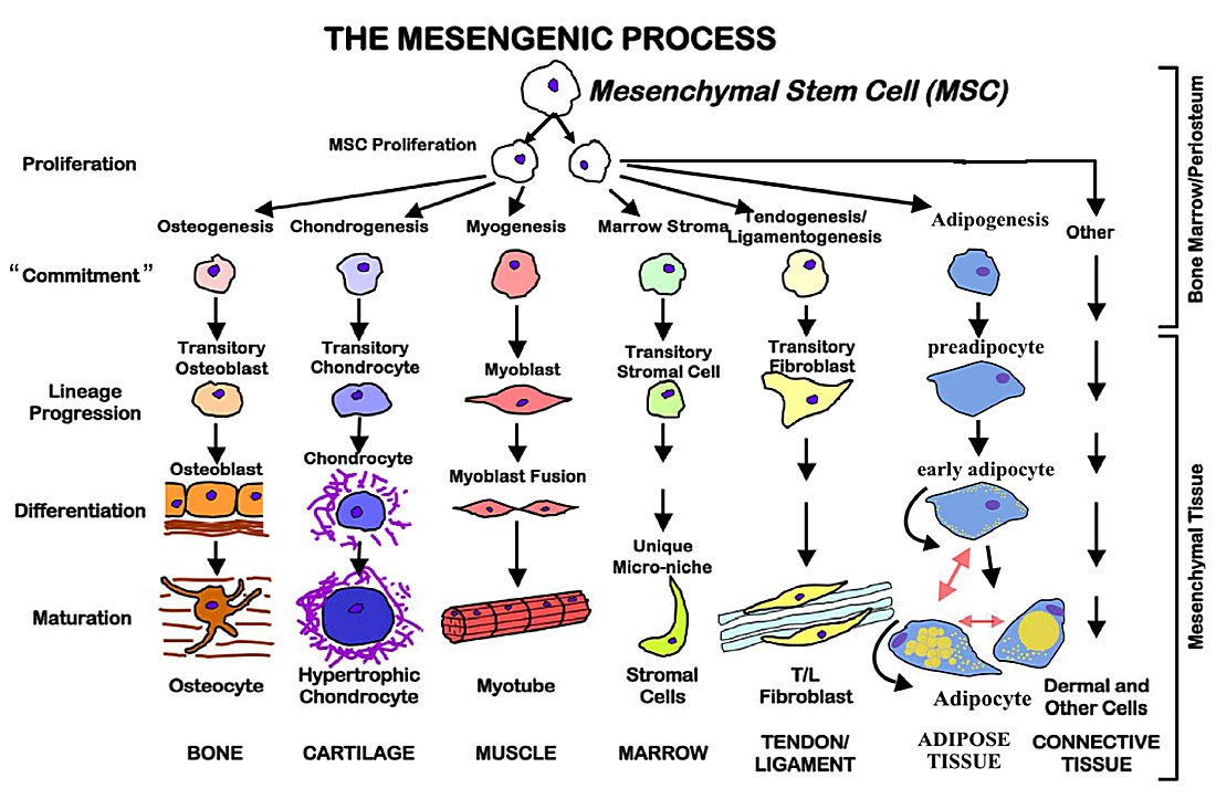 Within this pile of cells, mesenchymal stem cells have the job of “growing up” into structural cells, including bone, cartilage, muscle, fat (also called adipose), tendons, blood vessels, and the linings and padding that give us the structure of our bodies (called connective tissue or stroma).  Imagine the gristle you cut away from a chicken breast when you are skinning it- that’s connective tissue.  The chart below is a kind of map that shows all the “growing-up” or differentiation steps that mesenchymal stem cells take to become whatever grown-up cell they are going to be.  As adults we keep around a few mesenchymal stem cells to replace old and worn out cells.