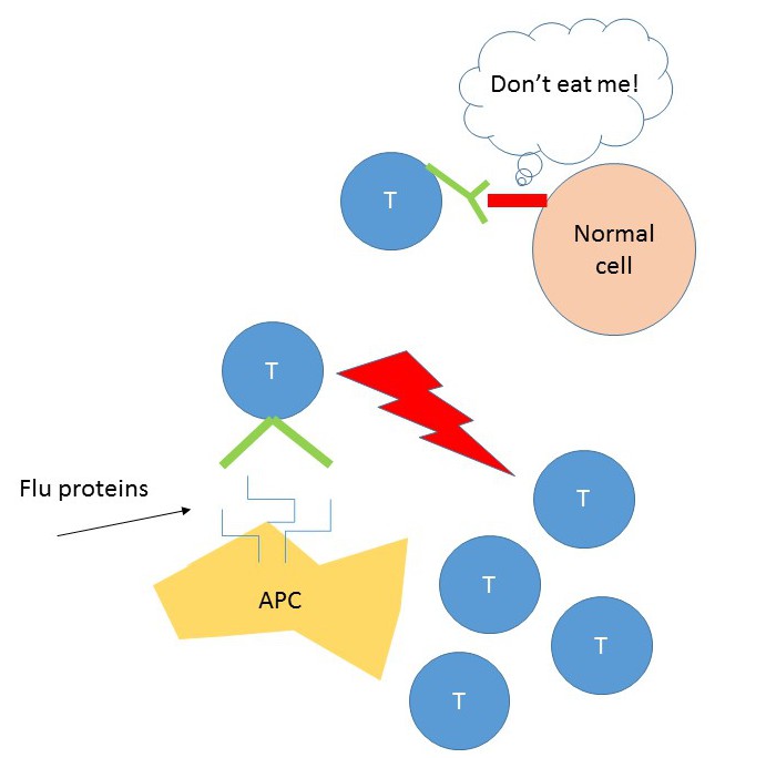 Let’s walk through a flu infection and review the several types of white blood cells that are important to know about in understanding the immune response. The flu viruses are made up of protein particles (antigens). When flu viruses enter the body, those protein particles floating around in your nose and mouth and lungs are picked up and processed by immune cells called “antigen-presenting cells”, including macrophages and dendritic cells. Just like your tattling younger siblings, the APCs pop the flu virus particles onto their surface and show them to the immune cells in charge. These “parental” immune cells are called T-cells. They decide that those flu proteins are evidence of a foreign invader, and need to be destroyed. They do this by launching a series of signals to recruit other T-cells and kickstart other immune processes (antibodies) to seek out that specific type of protein and destroy whatever it is attached to. Eventually, with enough “Flu-specific” T-cells floating around, all the flu viruses are detected, killed off, and cleaned up, and the body returns to normal. Even more amazingly, the body retains a few T-cells that remain “educated” about the flu virus, as memory T-cells, so that should that flu particle ever show up again, it is quick and easy to recruit and direct the immune response avoiding another all-out infection. Flu viruses change from year to year, which is why the flu vaccines are always slightly different and you need a new one each year, and also why you can get flu over and over again.